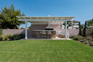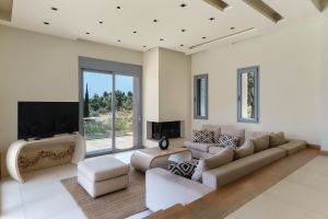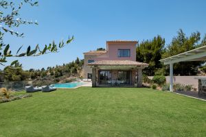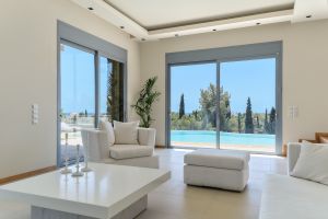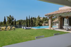 The outdoor area includes a private garden with a swimming pool and a BBQ area, perfect for relaxing and enjoying meals outdoors. The villa is set in a peaceful location, close to the beaches and Porto Heli.