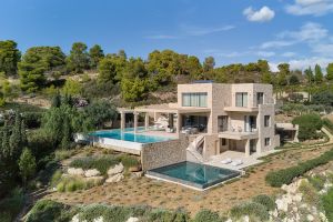 In the exclusive area of Chinitsa in Porto heli, just a short distance from the beach and with views towards Spetses, lies a modern villa that combines clean architectural lines with a functional layout. The residence spans three levels, featuring main living areas, a kitchen and bedrooms with en-suite bathrooms, and also includes a seperate guest house.