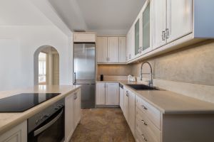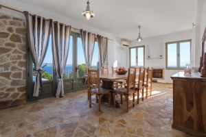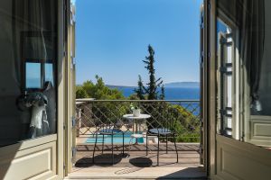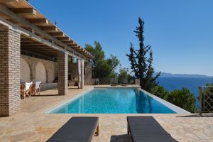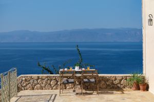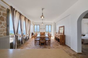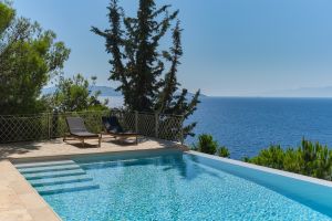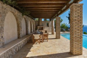 Moving outside you are overwhelmed of the exquisite view of the iridescent sea and the natural carved coves, combined with the evergreen pine forest. There you can relax by the pool or enjoy a divine dinner, at the open space dining area, or even have a rejoicing outdoor BBQ under the stars!